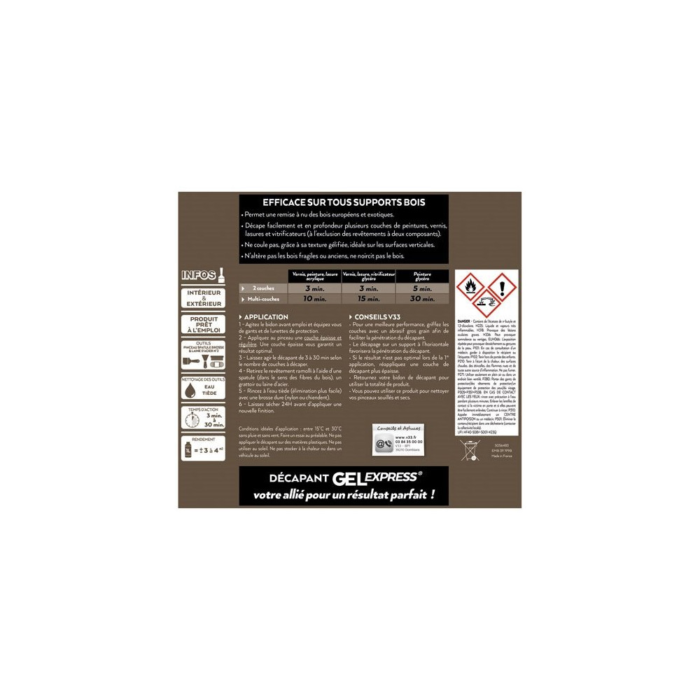 Existe en plusieurs contenances Le décapant gel express spécial bois à action rapide de 0.5L de la marque V33 est la solution pour retrouver l'aspect naturel du bois sans abîmer le support. Il décape ainsi en quelques minutes facilement et en profondeur les peintures, vernis, lasures et vitrificateurs sur plusieurs couches, et il favorise une excellente pénétration. Très simple à appliquer grâce à sa texture gel, il ne coule pas à l'application sur les surfaces verticales et il suffit de badigeo