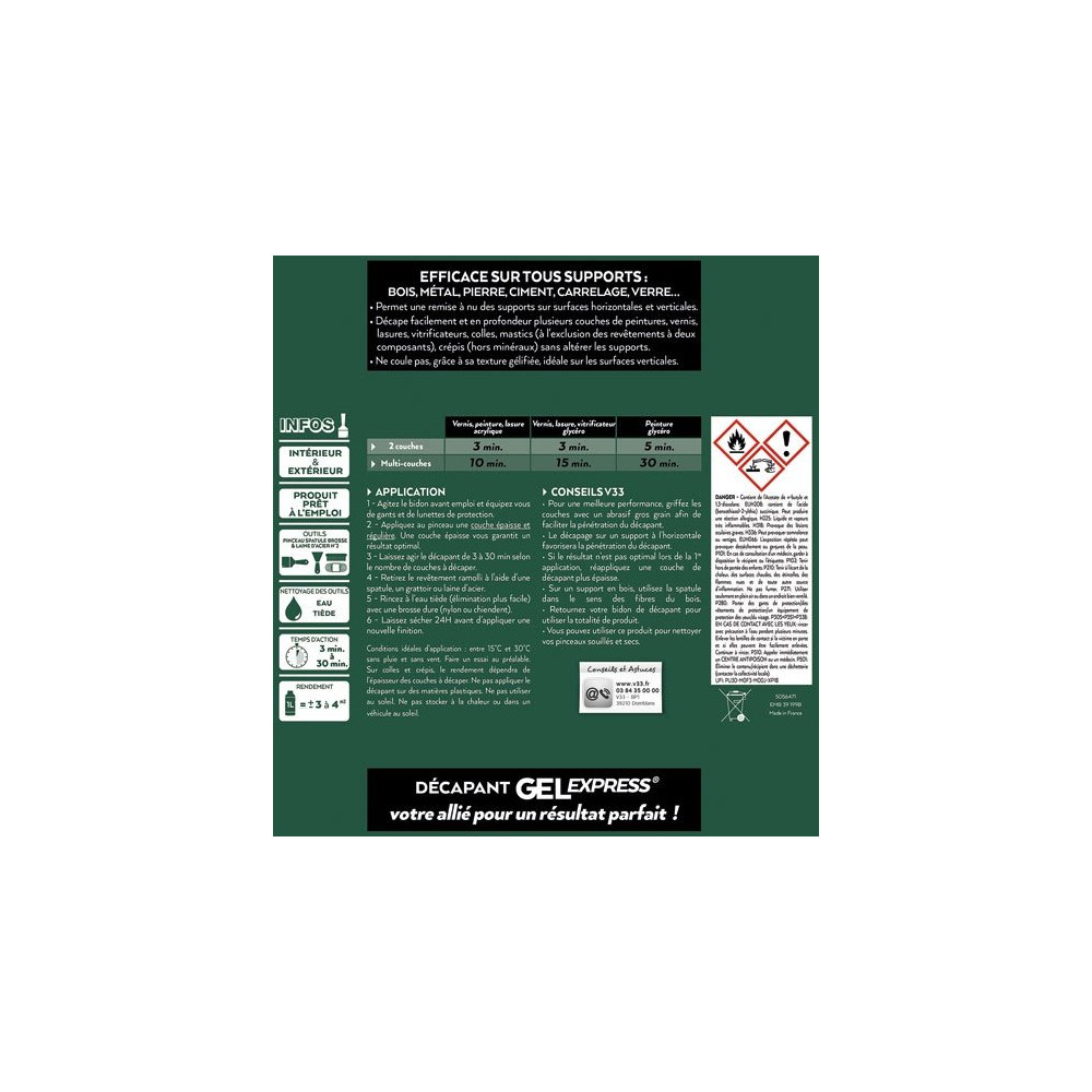 Appliquez le gel généreusement sur la surface à traiter à l'aide d'un pinceau ou d'une spatule, puis laissez agir selon l'épaisseur du revêtement à décaper. Retirez le produit avec une spatule ou une brosse dure, puis rincez soigneusement le support avant toute nouvelle mise en peinture. Portez systématiquement des équipements de protection individuelle adaptés.