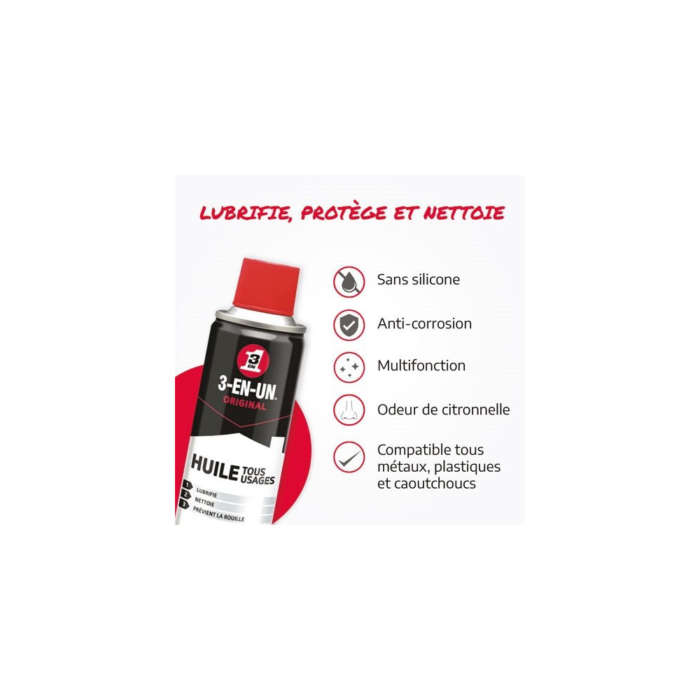 Véritable institution dans le monde du bricolage et de la mécanique, l'Huile Tous Usages 3-EN-UN en flacon de 200 ml est la référence incontournable pour tous ceux qui veulent entretenir, lubrifier et protéger leurs équipements avec un seul produit polyvalent. Sa formule originale à base d'huile minérale de haute qualité n'a pas pris une ride depuis des décennies.