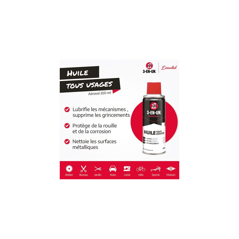 Son champ d'application est quasi illimité : serrures et cadenas, vélos et trottinettes, outils de jardinage et de bricolage, mécanismes de volets roulants, fixations et visserie, pièces métalliques exposées aux intempéries… Le flacon 200 ml de l'Huile 3-EN-UN s'emporte facilement dans une boîte à outils et répond présent à chaque besoin du quotidien.