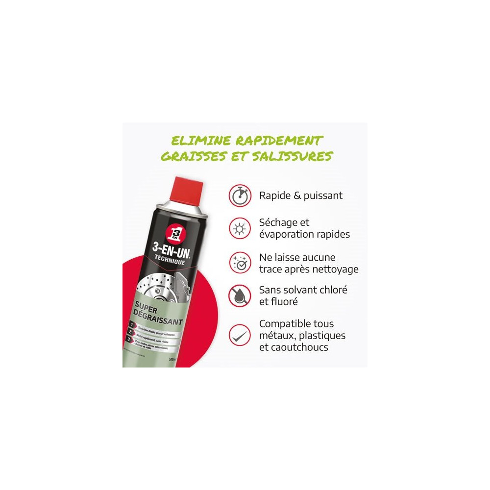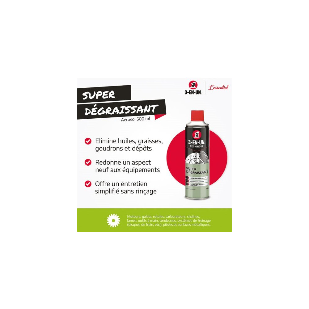 Ce dégraissant 3-EN-UN convient aussi bien aux professionnels de la mécanique qu'aux bricoleurs chevronnés souhaitant entretenir et remettre en état leurs équipements. Retrouvez-le facilement parmi la sélection de produits d'entretien proposés par Brikoleur. Pensez à utiliser le produit dans un endroit bien ventilé et à protéger les surfaces environnantes lors de l'application pour un résultat optimal.