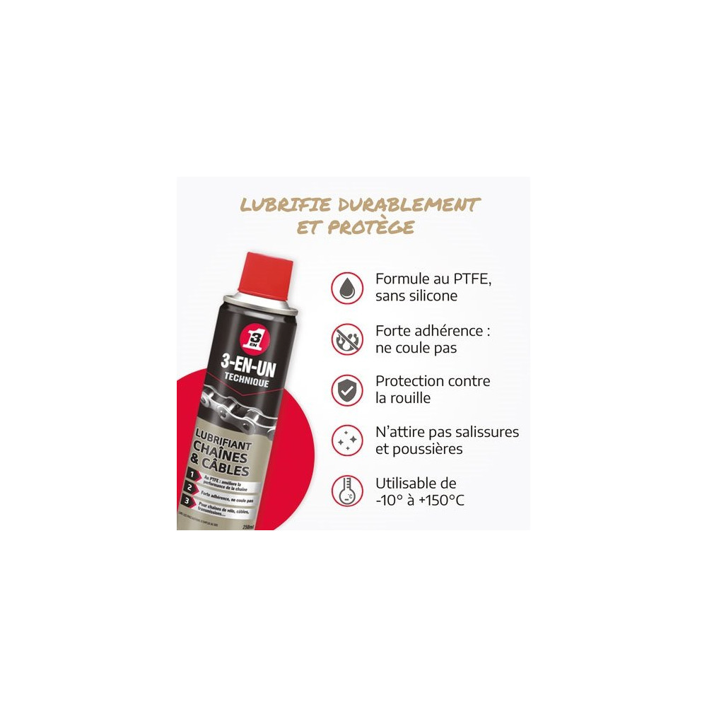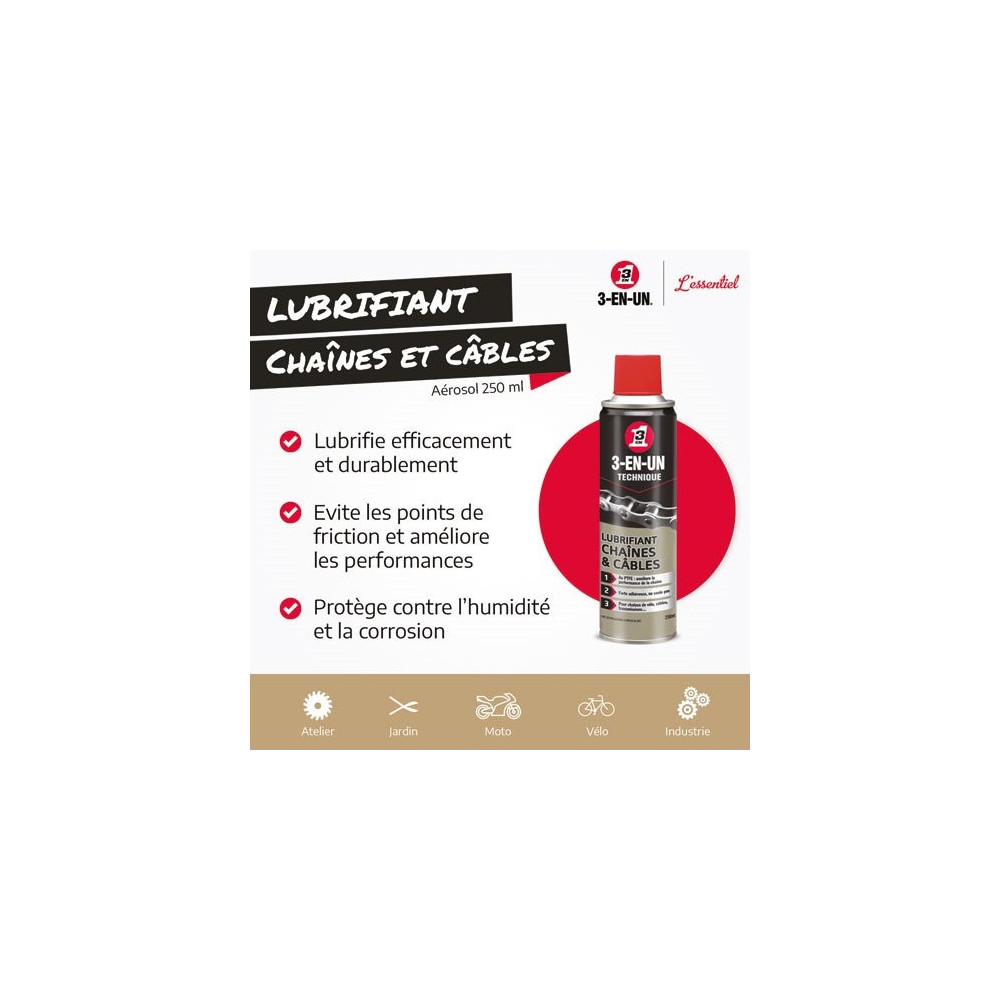 Spécialement développée pour les mécanismes à forte sollicitation, la bombe Lubrifiant Chaîne et Câble 3-EN-UN de 250 ml offre une protection haute performance sur la durée. Que ce soit pour une chaîne de vélo, de moto, ou pour des câbles de commande, ce produit assure un fonctionnement fluide et fiable en toutes conditions.