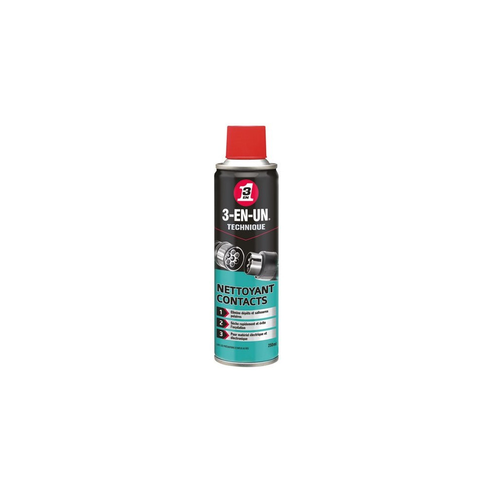 La bombe nettoyant Contacts de 250 mL de la marque 3-EN-UN TECHNIQUE agit rapidement et assure la longévité de vos équipements en supprimant les dépôts de gras, de salissures polaires et de salissures diverses sur les équipements électriques et électroniques, en rétablissant les contacts et en évitant l'oxydation. Sa formule sans solvants chlorés est compatible avec la plupart des métaux, plastiques et caoutchoucs (effectuer un essai en cas de doute). Elle s'utilise sur des supports froids et s'