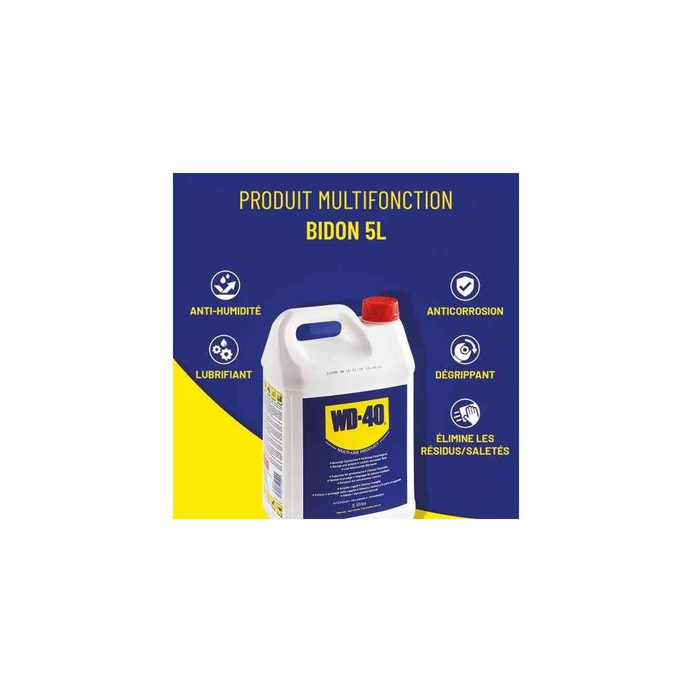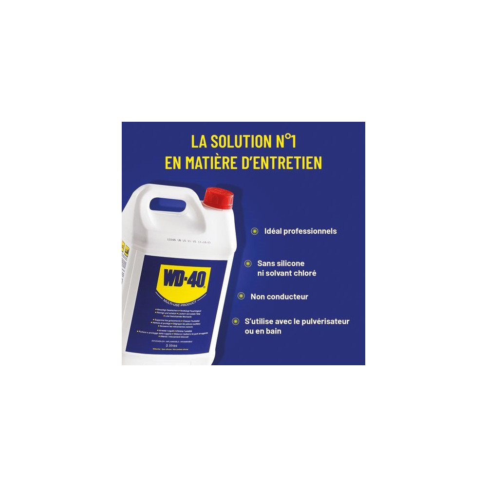 Quand les besoins en entretien et en protection sont importants, le format professionnel s'impose. Le WD-40 en bidon de 5 litres offre l'économie et la praticité qu'exigent les ateliers, garages, exploitations agricoles et sites industriels. Ce produit culte, reconnu dans le monde entier, délivre ses multiples actions sur tous les métaux et mécanismes avec la même fiabilité qu'en petit format.