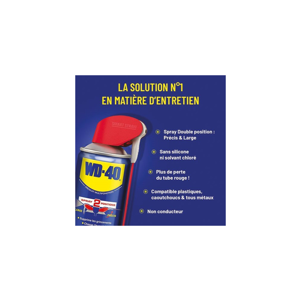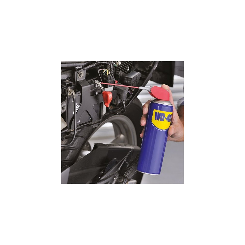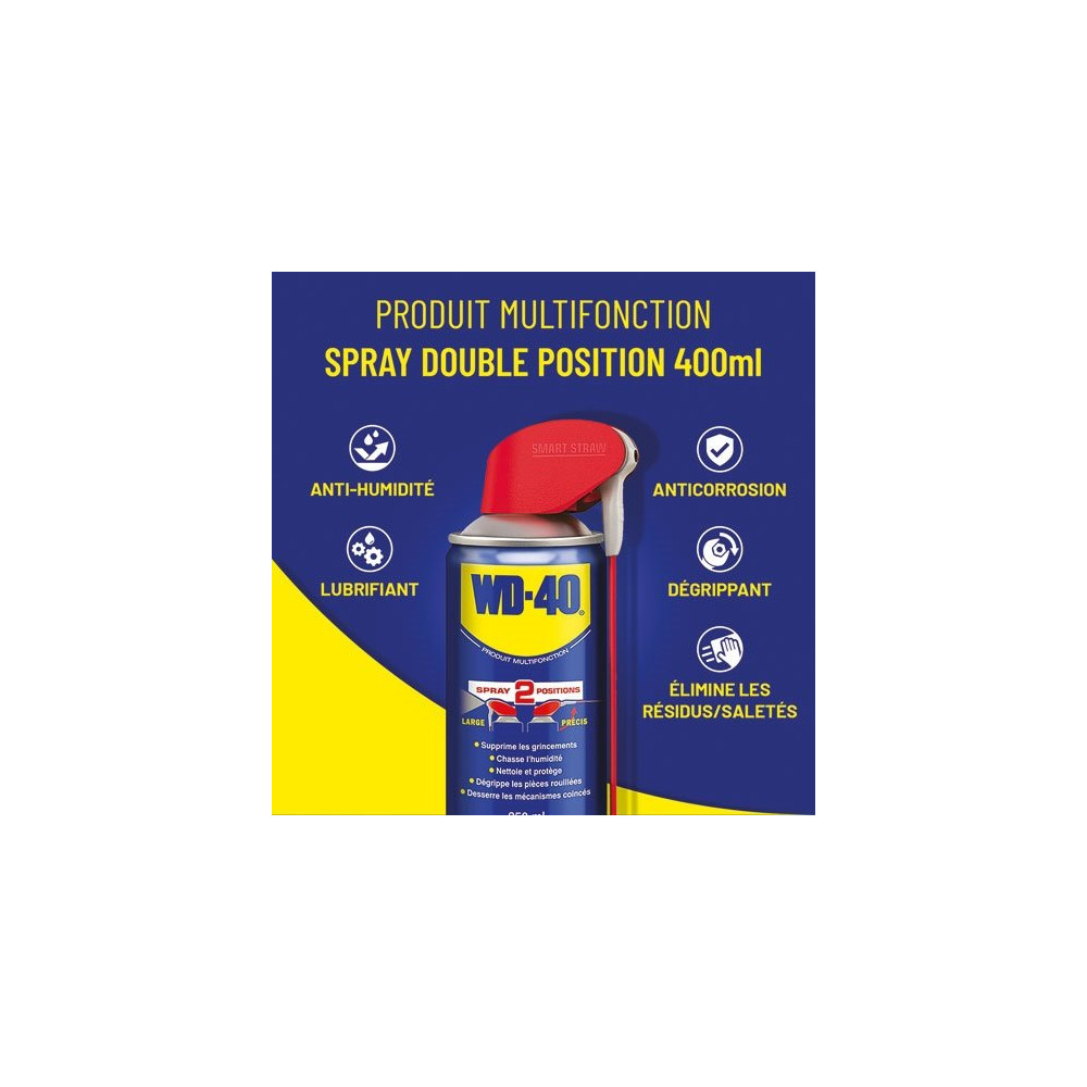 Le WD-40 Multifonction en spray double position 400 ml est l'indispensable de tout atelier, garage ou boîte à outils bien équipée. Reconnu dans le monde entier pour ses performances polyvalentes, ce produit traite en une seule application une large gamme de problèmes mécaniques et d'entretien du quotidien.