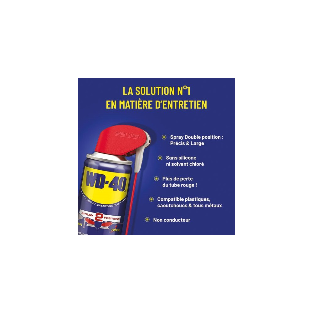 Multifonction : | Anti-humidité, Anticorrosion, Dégrippant, Nettoyant et Lubrifiant. | Supprime les grincements, chasse l'humidité, Dégrippe, Nettoie, Protège et Desserre. | WD-40 est sans silicone et non conducteur. | Avec tube prolongateur.