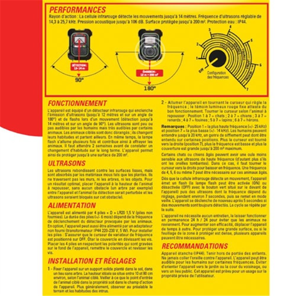 Son capteur de détection de mouvement surveille une zone d'environ 14 mètres de rayon sur un angle de 90°, déclenchant instantanément une réaction dissuasive dès qu'un animal s'approche. La triple action combinée — ultrasons haute fréquence, flash effaroucheur lumineux et signal sonore — crée un effet de surprise efficace qui conditionne les animaux à éviter la zone protégée, sans les blesser ni les stresser de façon durable.