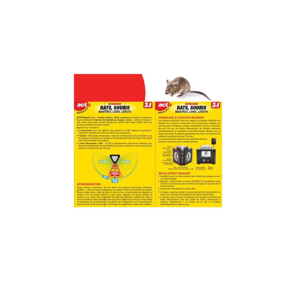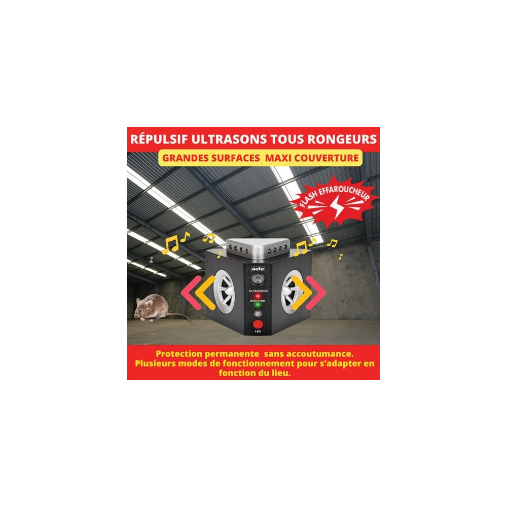 À la différence des pièges ou des poisons, ce répulsif ACTO n'implique aucune manipulation de nuisible mort ni aucun risque pour les enfants ou les animaux de compagnie. Il fonctionne en continu, 24h/24, ce qui garantit une protection permanente sans intervention régulière de l'utilisateur. Idéal pour les caves, greniers, garages, entrepôts ou toute pièce sujette aux intrusions de rongeurs.