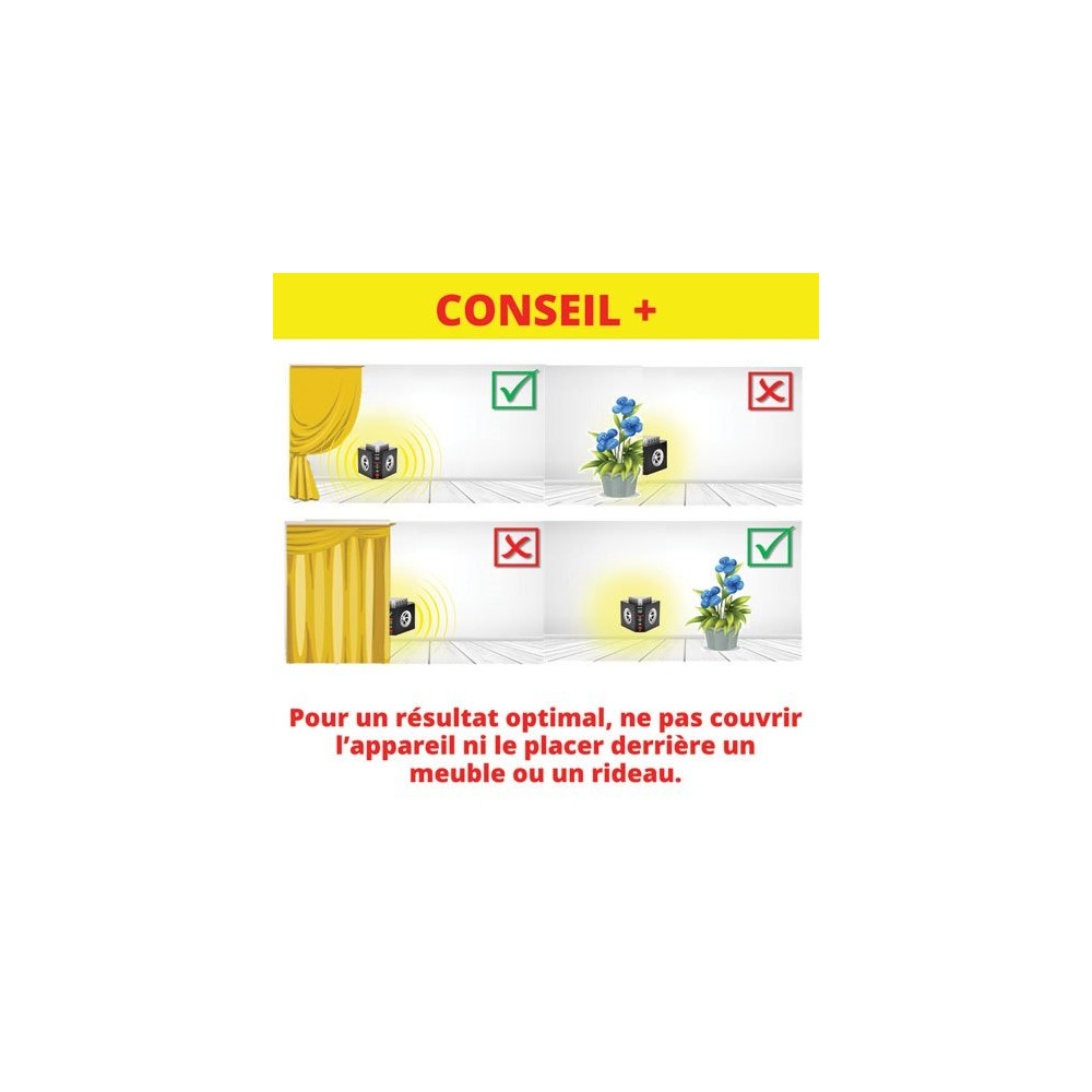 Pour une efficacité optimale, installez l'appareil dans la pièce la plus fréquentée par les nuisibles, de préférence en hauteur et sans obstacle face aux haut-parleurs. Comptez plusieurs semaines avant d'observer une disparition totale des nuisibles — la persistance est la clé. En cas d'infestation importante, l'utilisation de plusieurs unités en complément est recommandée.
