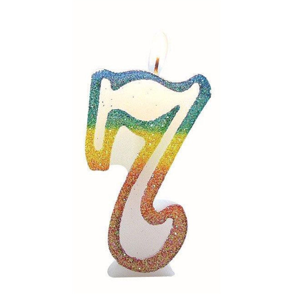 Bougie Chiffre 7 Arc-en-Ciel pailletée. | Hauteur 8cm. | Largeur 4cm.