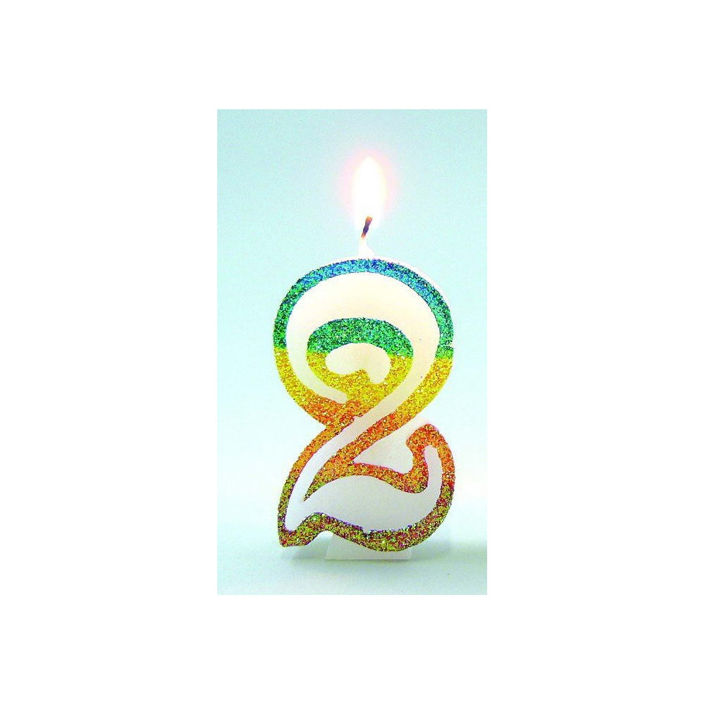 Bougie Chiffre 2 Arc-en-Ciel pailletée. | Hauteur 8cm. | Largeur 4cm.
