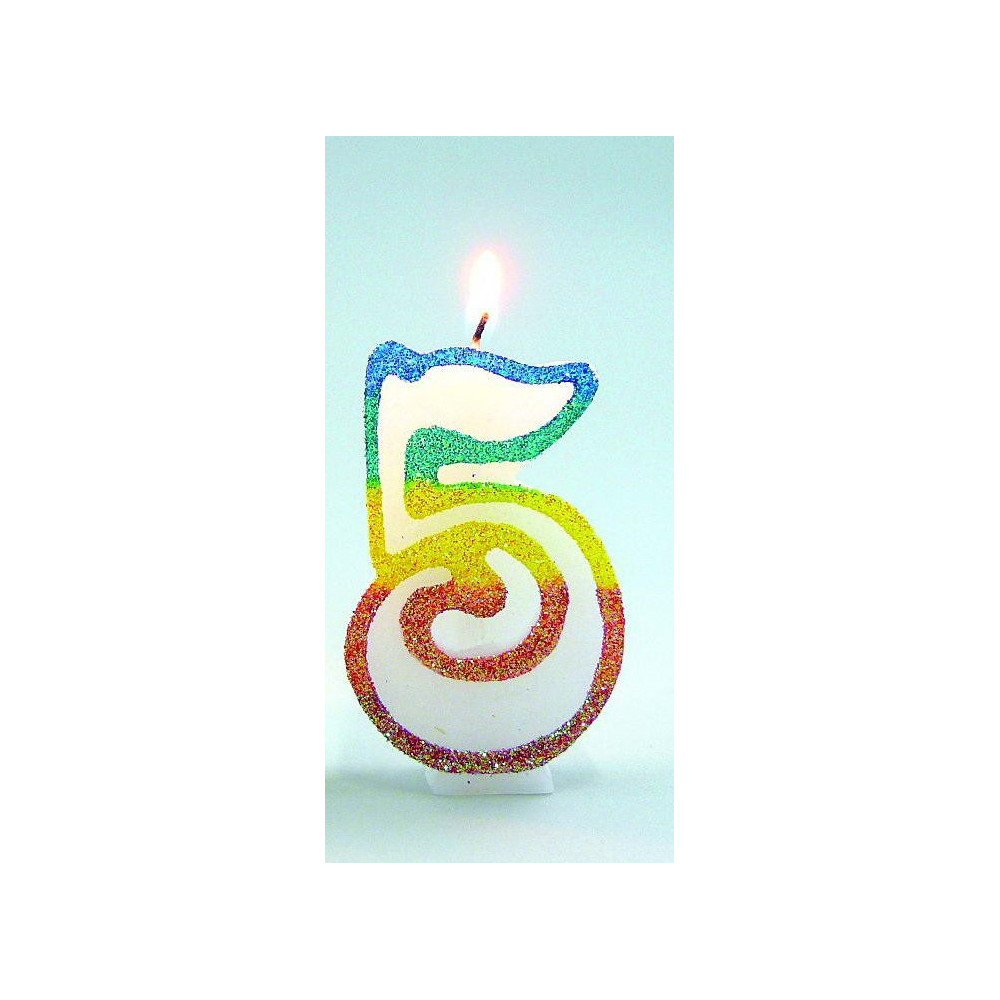 Bougie Chiffre 5 Arc-en-Ciel pailletée. | Hauteur 8cm. | Largeur 4cm.