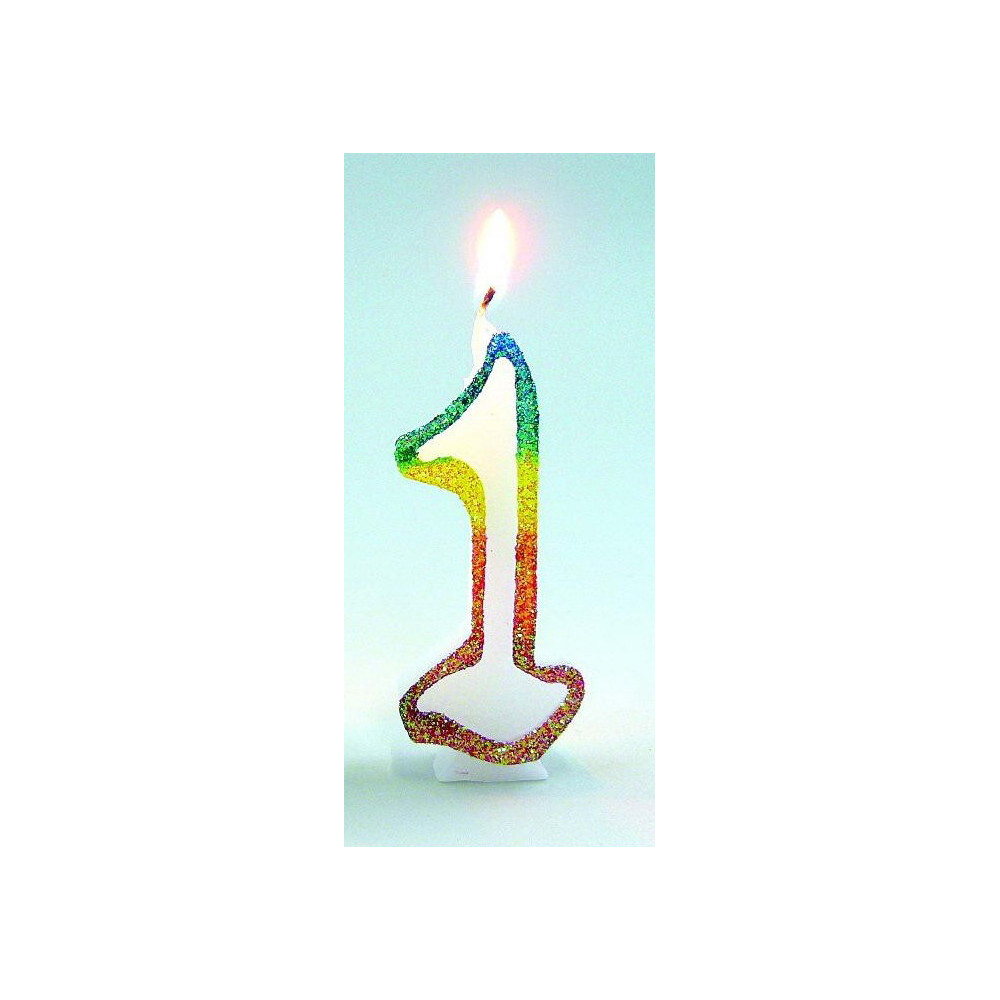 Bougie chiffre 1 Arc-en-Ciel pailletée. | Hauteur 8cm. | Largeur 4cm.