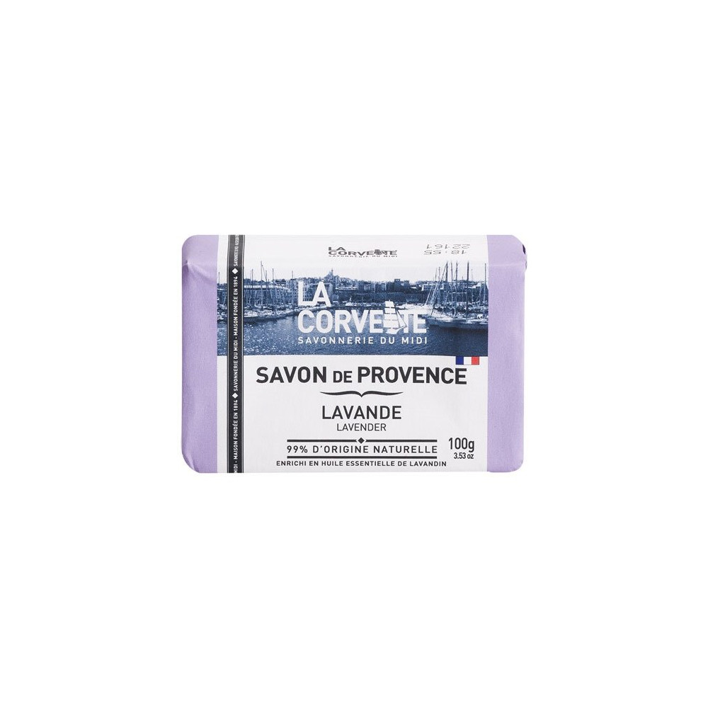 Indétrônable symbole de la Provence, la lavande parfume délicatement cette savonnette de Provence LA CORVETTE 100 g. Fabriquée à Marseille dans la tradition des grands savonniers du Sud, elle combine un nettoyage efficace à un soin respectueux de toutes les peaux, pour un geste d'hygiène aussi authentique qu'agréable.