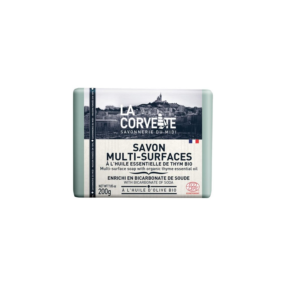 Le Savon Multisurfaces LA CORVETTE au Thym, proposé en pain solide de 200 g, représente une alternative naturelle et efficace aux nettoyants ménagers conventionnels. Certifié Ecocert et formulé sans huile de palme, il conjugue respect de l'environnement et performance nettoyante pour répondre aux exigences d'un intérieur propre au quotidien.