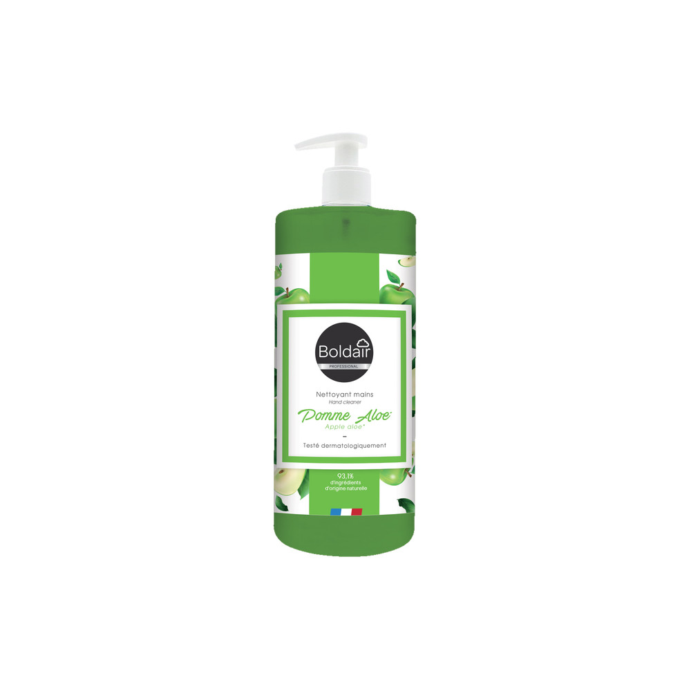 Formulé spécialement pour les environnements professionnels à fort trafic, le Savon Nettoyant Mains Pomme Aloé BOLDAIR allie efficacité nettoyante et respect de la peau. Sa composition 93% naturelle séduit autant par ses vertus douces que par son parfum frais et fruité de pomme verte associé aux bienfaits de l'aloé vera.