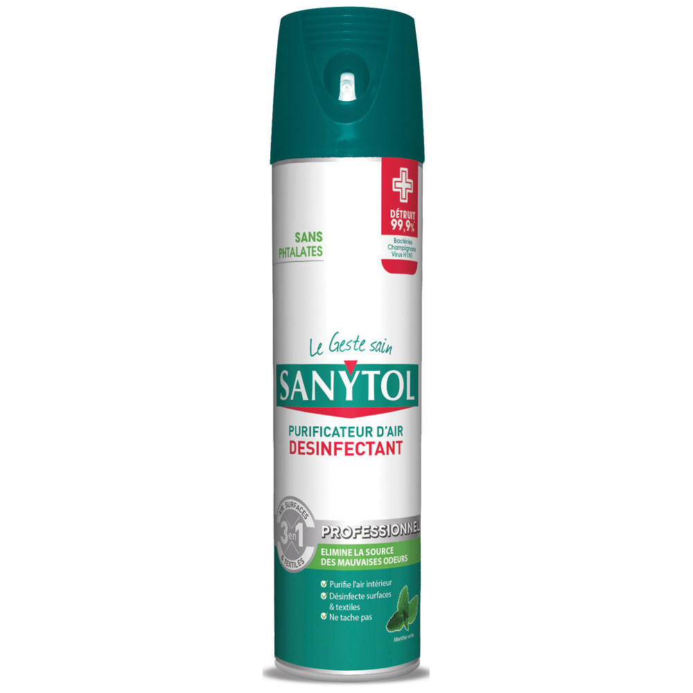 Le Désinfectant Purificateur d'Air SANYTOL en aérosol de 600 ml, parfum Menthe Verte, est une solution hygiénique complète qui agit simultanément sur l'air ambiant, les surfaces et les textiles. En un seul geste, il transforme l'atmosphère de votre domicile en éliminant les agents pathogènes invisibles et en laissant un souffle frais et agréable de menthe verte.