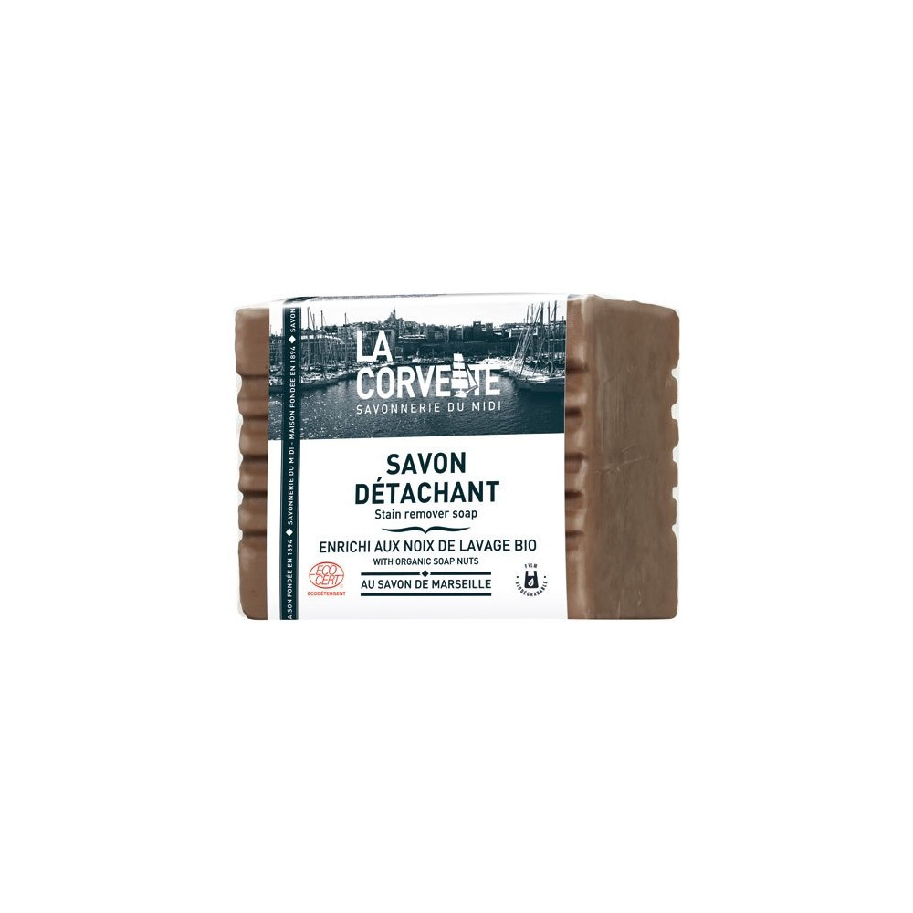 Traiter une tache rapidement et efficacement sans produit chimique agressif : c'est exactement ce que propose le savon détachant 250 g de LA CORVETTE, enrichi aux noix de lavage certifié Ecocert. Ce pain de savon solide, à la texture ferme et dense, s'applique directement sur la tache à traiter avant le lavage en machine ou à la main, pour un détachage ciblé et puissant.