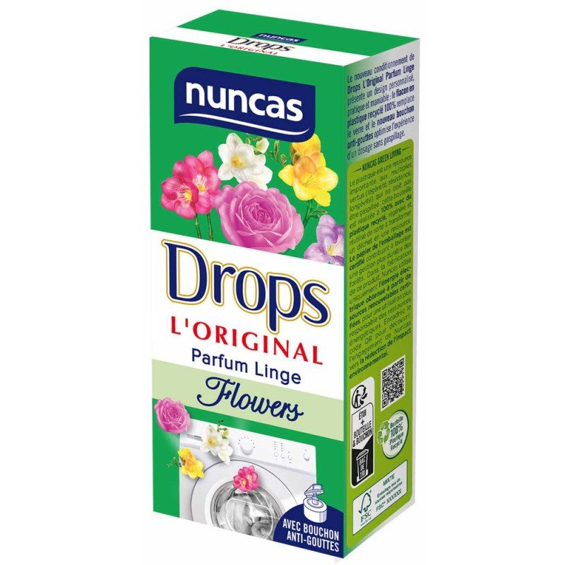 Drops L'Original Parfum Linge Flowers est un parfum liquide concentré spécifique pour le linge, indispensable pour lui donner une odeur agréable. | On lajoute au dernier rinçage ou on le dilue dans leau du vaporisateur qui sert à humidifier les tissus avant de les repasser. Son parfum d'une tenue longue durée reste aussi dans les armoires, desquelles il élimine lodeur dhumidité et de renfermé car il donne à tout le linge une note vraiment spéciale.