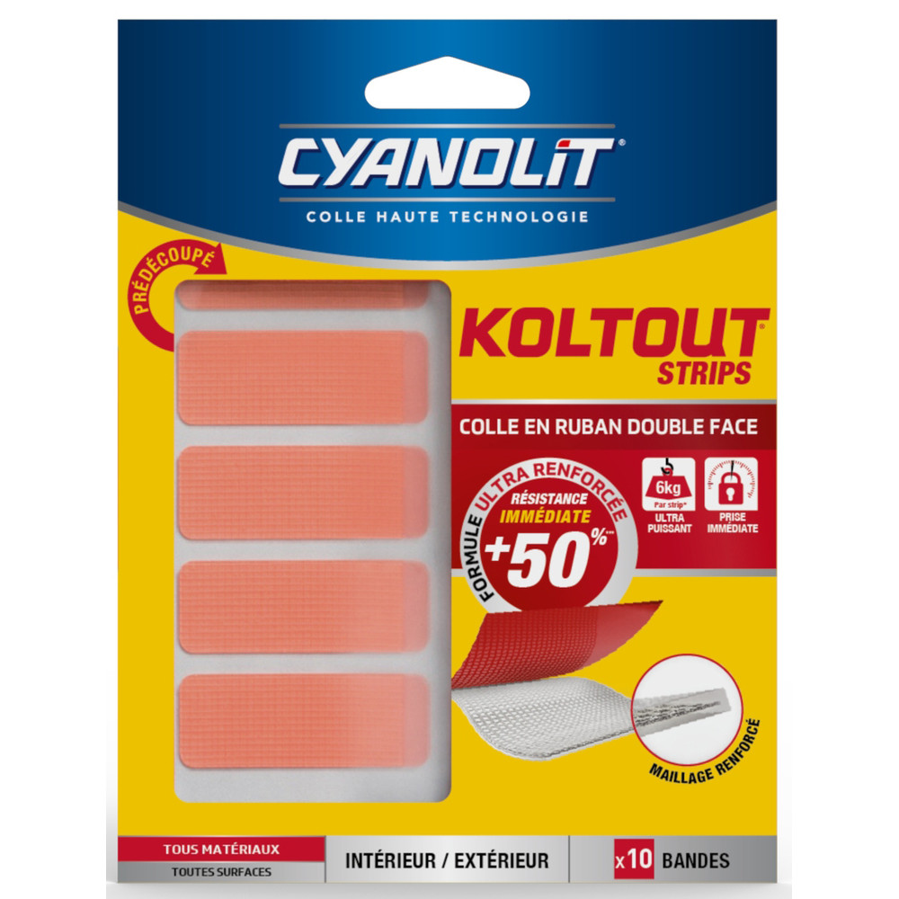 Fini les découpes fastidieuses de ruban adhésif double face : avec les Strips prédécoupés KOLTOUT, profitez de la puissance d'un double face ultra-renforcé directement au format prêt à l'emploi. Ce lot de 10 strips prédécoupés offre une fixation immédiate, propre et invisible, sans outil ni perçage.