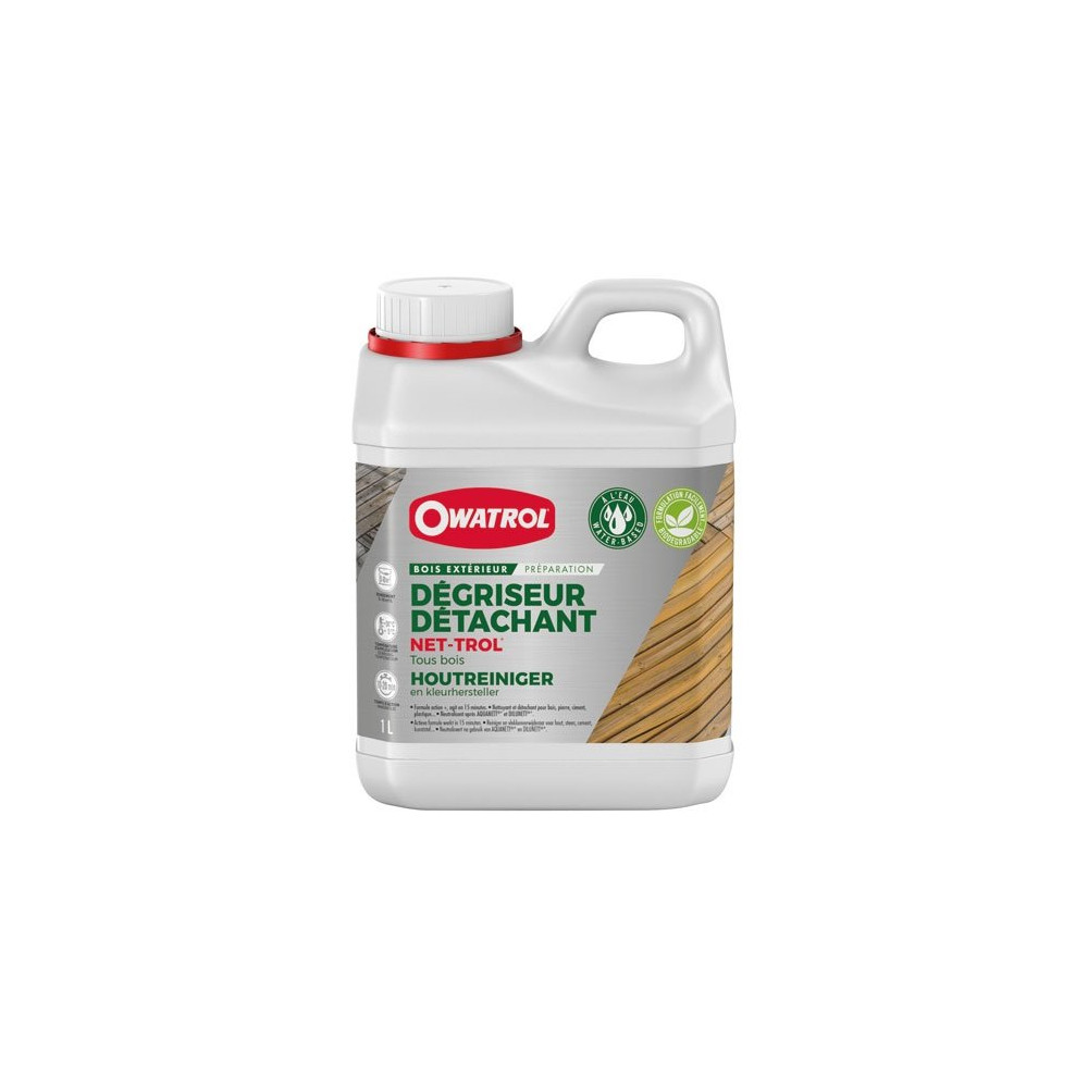 Redonner au bois, à la pierre ou au plastique leur éclat d'origine n'a jamais été aussi simple grâce au Net-Trol OWATROL en bidon de 1 litre. Ce dégriseur professionnel à haute efficacité est spécialement conçu pour éliminer le grisaillement, les taches d'origine organique et les salissures incrustées sur les surfaces extérieures exposées aux intempéries. Un indispensable avant tout traitement ou application de saturateur.