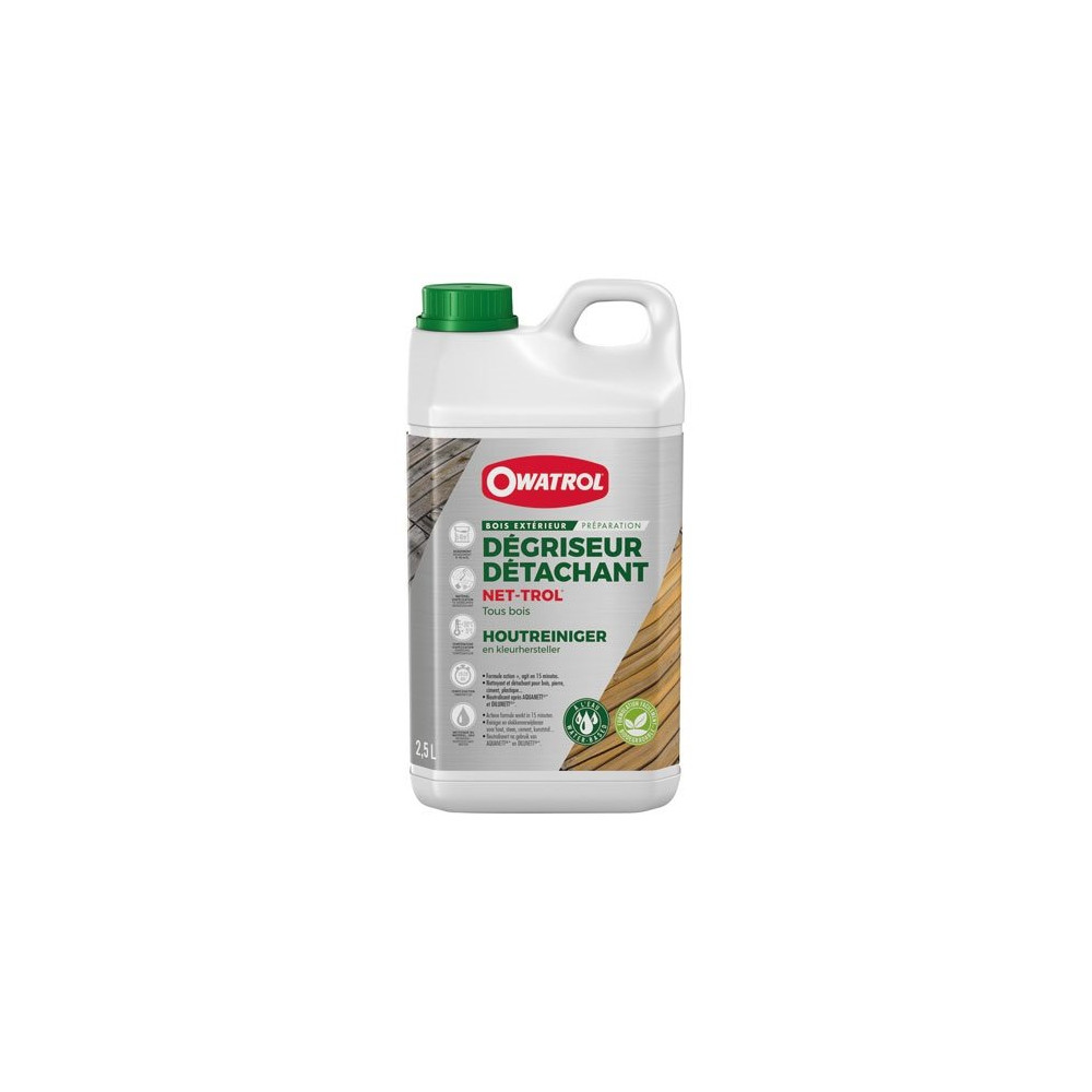 Disponible chez Brikoleur, le Net-Trol Owatrol 2,5 litres est le format idéal pour un chantier de taille intermédiaire : rénover une terrasse, rafraîchir une palissade ou préparer un bardage avant traitement. Pensez à bien rincer la surface à l'eau claire après action du produit et à laisser sécher complètement avant d'appliquer votre lasure ou saturateur.