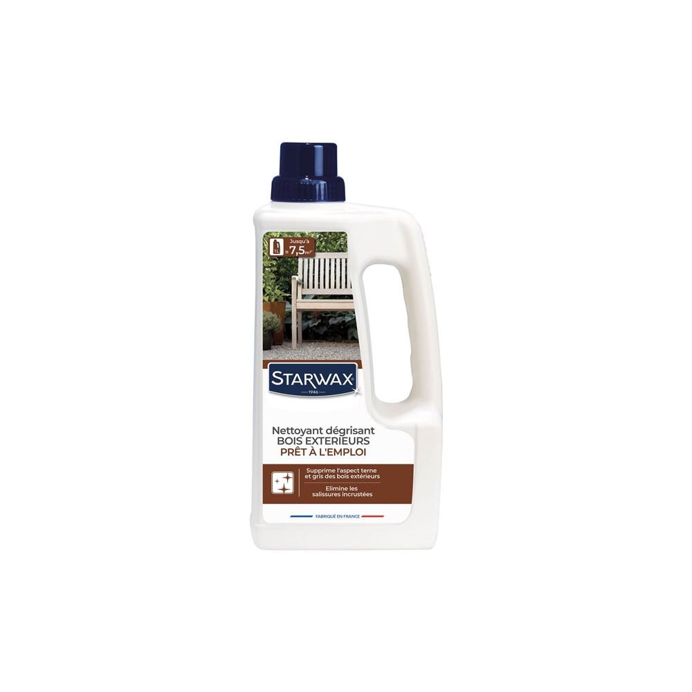 Le Nettoyant Dégriseur Teck et Bois Exotiques STARWAX en format 1 litre est la solution idéale pour redonner vie aux boiseries extérieures qui ont perdu leur éclat. Avec le temps, le teck, l'ipé, le merbau et autres bois exotiques grisonnent sous l'effet des UV, de l'humidité et des intempéries. Ce produit formulé spécifiquement agit en profondeur pour éliminer le grisaillement superficiel et retrouver la teinte naturelle chaleureuse du bois.