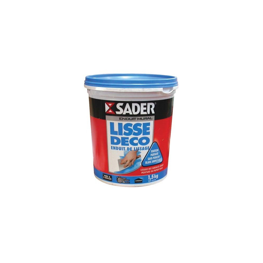 Enduit de lissage mural Déco SADER, pour un lissage et un rebouchage impeccables des surfaces avant la mise en peinture ou la pose de papier peint. Prêt à l'emploi. Type : pâte. Quantité : 1.5 Kg.. Coloris : blanc. Parfait pour le lissage des murs et de plafonds, le rebouchage de petits trous, éclats, rayures Convient sur tous supports plâtre et plaques de plâtre cartonnées, mortier, béton, ciment, bois et briques. Assure une finition parfaite sans poncer.