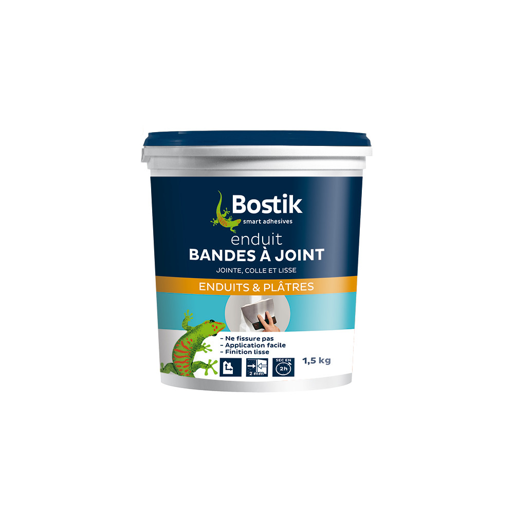 L'enduit Bandes à Joint Bostik jointe, lisse et colle. Il permet de combler les espaces entre deux plaques de plâtre et prévient des fissures. | | Supports : Plaques de plâtre cartonnées peintes ou non. | | Destination : intérieur. | | Si pièces humides, utiliser un imperméabilisant sous carrelage au préalable. | | - Ne fissure pas | - Application facile | - Finition lisse | - Sec en 2 heures