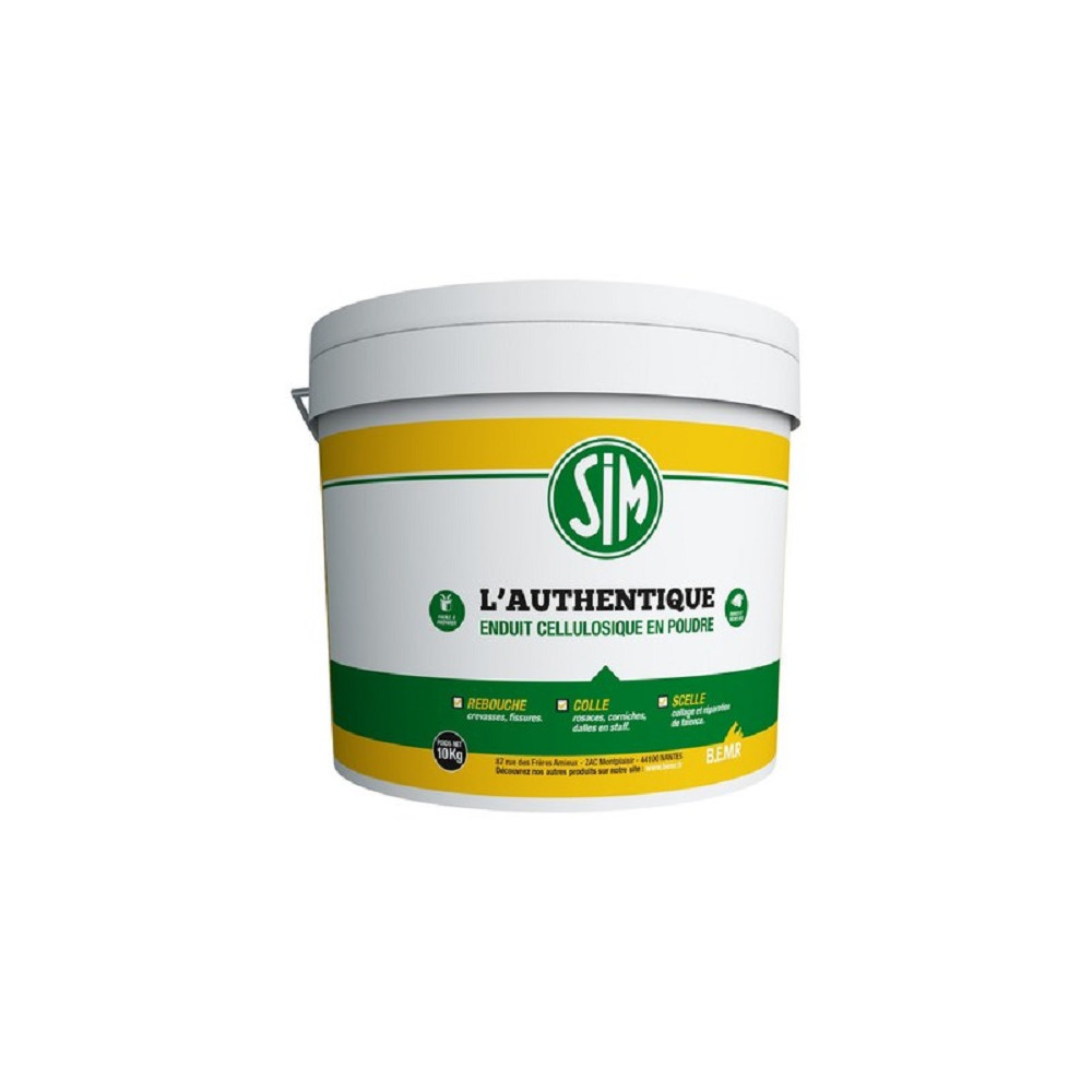 Sim l'Authentique de SIM est un enduit de rebouchage intérieur en poudre à base d'éthers cellulosiques, une formule éprouvée qui fait référence dans les travaux de finition intérieure. Ce conditionnement de 10kg en fait un choix particulièrement adapté aux chantiers de rénovation de grande surface, où la régularité de la préparation des murs est essentielle avant la pose de peinture ou de revêtements muraux.