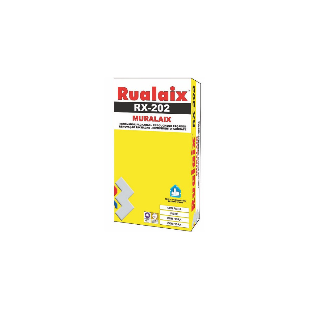 Le RX-202 Muralaix de RUALAIX en sac de 5 kg est un enduit reboucheur extérieur fibré en poudre, spécialement formulé pour la réparation et la rénovation des façades lisses. Sa texture fine et sa charge en fibres lui confèrent une excellente résistance mécanique, assurant une finition dure et lisse parfaitement adaptée aux surfaces extérieures exposées aux intempéries.