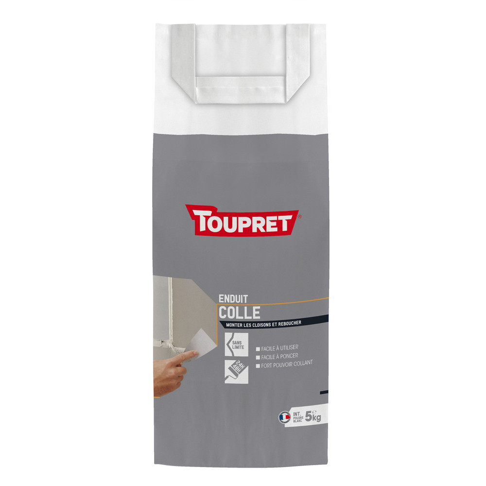 L'enduit colle en poudre TOUPRET, disponible en format 5 kg, est la référence pour la pose de carreaux de plâtre et les travaux de rebouchage intérieur. Deux usages en un seul produit : coller des cloisons légères et combler les trous dans les murs, avec la solidité et la facilité d'utilisation propres à la marque TOUPRET.