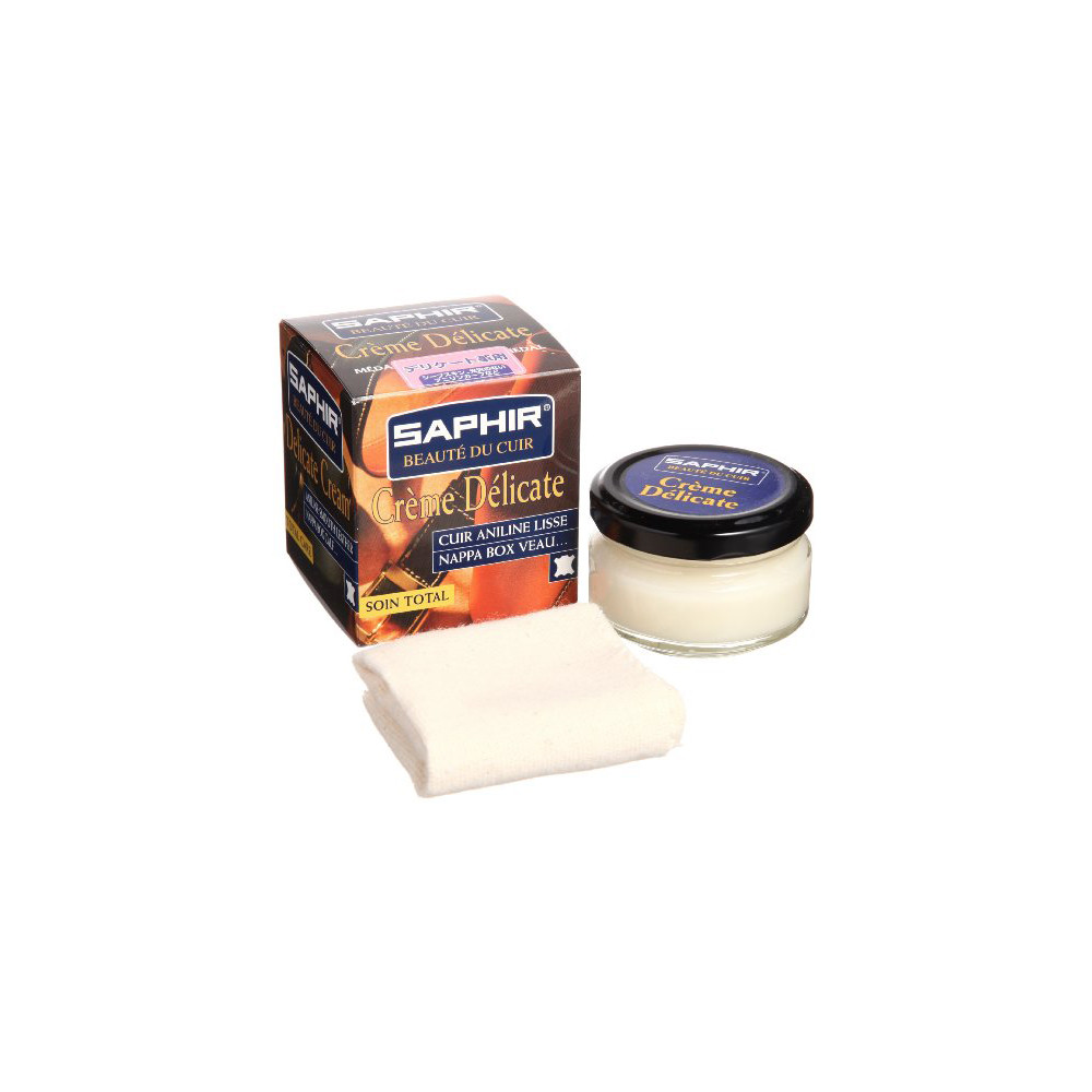 Crème Délicate Saphir 50ml est faite pour tous les cuirs et peausseries lisses, nappa, box, veau. | Elle nettoie, nourrit & embellit. Sa formule extrêmement douce, ne change pas l'aspect et la finition du cuir traité. C'est pour cela que cette crème est unique et est largement conseillée par les professionnels pour les cuirs délicats.