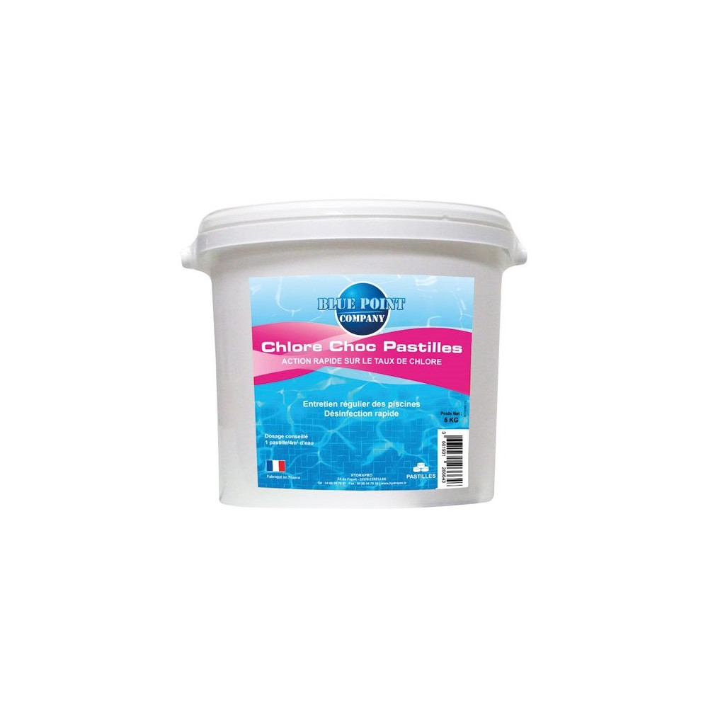 Les pastilles choc chlore PROQUISWIM de Blue Point Company sont formulées à base d'acide trichloroisocyanurique pour une action désinfectante immédiate et très puissante. Conditionnées en pot bleu de 5 kg, ces pastilles de 20 g sont idéales pour traiter rapidement une eau de piscine dégradée ou pour intervenir en situation d'urgence sanitaire.