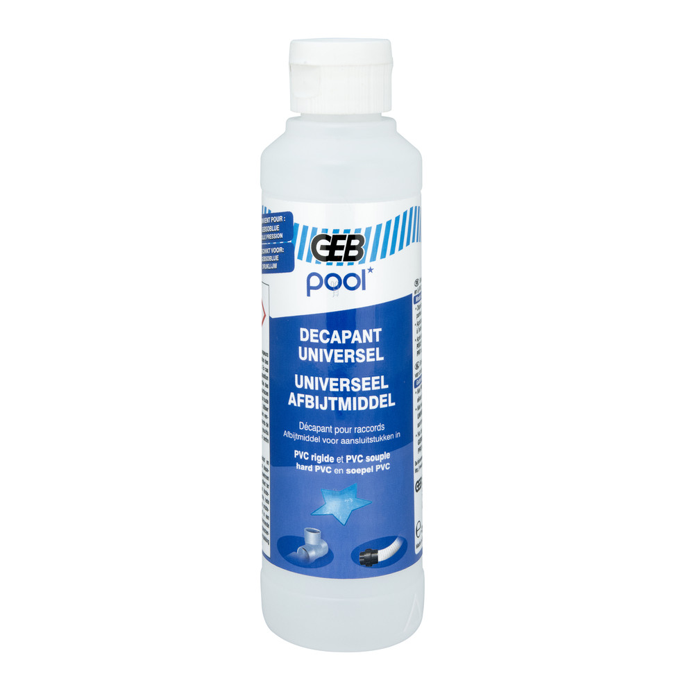 Retrouvez ce décapant GEB POOL chez Brikoleur pour mener à bien vos travaux de plomberie et d'installation piscine. Appliquez-le généreusement à l'aide d'un pinceau ou d'un chiffon sur les deux pièces à assembler, puis procédez au collage dans le délai préconisé. Conservez le bidon bien fermé, à l'abri de la chaleur et des sources d'ignition.