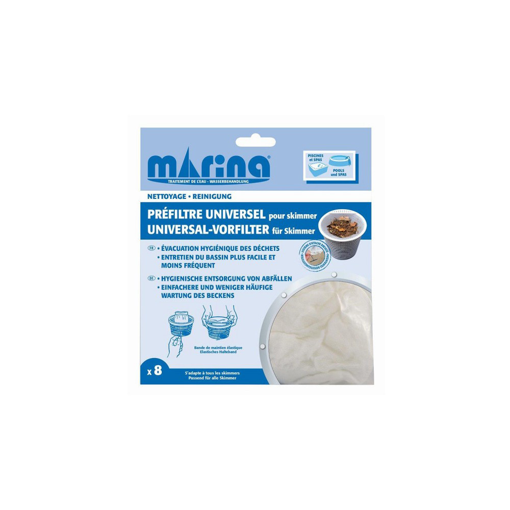 Simplifiez l'entretien de votre skimmer avec les Préfiltres Universels Marina pour skimmer, vendus par lot de 8. Ces préfiltres jetables sont conçus pour s'insérer dans le panier de votre skimmer et intercepter feuilles, insectes, cheveux et débris avant qu'ils n'atteignent la pompe de filtration, prolongeant ainsi la durée de vie de votre installation.