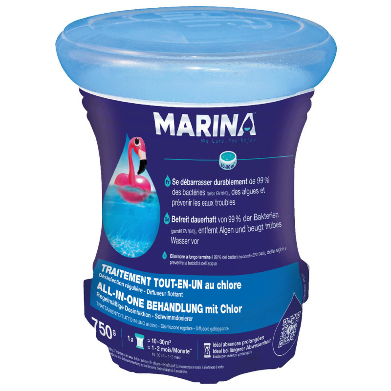 Profitez d'une désinfection automatique, régulière et longue durée grâce au Diffuseur Flottant Traitement Complet MARINA 750g, conçu pour les piscines de 10 à 30 m³. Ce diffuseur tout-en-un flotte en surface et libère progressivement ses actifs désinfectants, anti-algues et clarifiants pour maintenir une eau impeccable avec un minimum d'intervention.