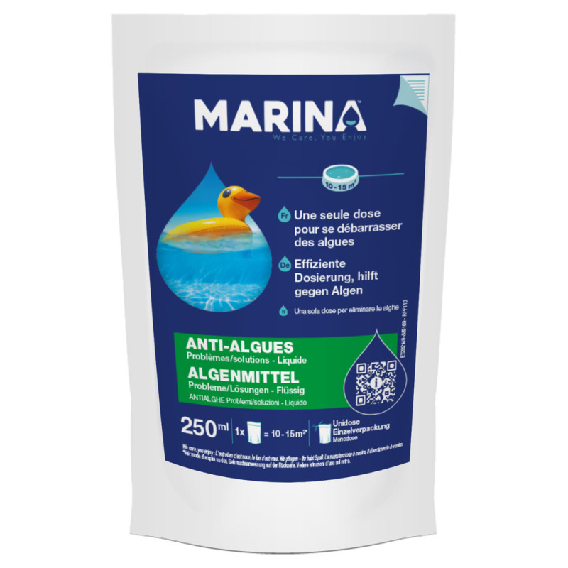 Pratique et efficace, l'Anti-Algues 2en1 MARINA en unidose de 250ml est la solution idéale pour traiter ponctuellement une piscine envahie par les algues ou pour prévenir leur réapparition après un traitement choc. En une seule dose, vous bénéficiez d'une double action : destruction des algues existantes et protection préventive contre leur retour.