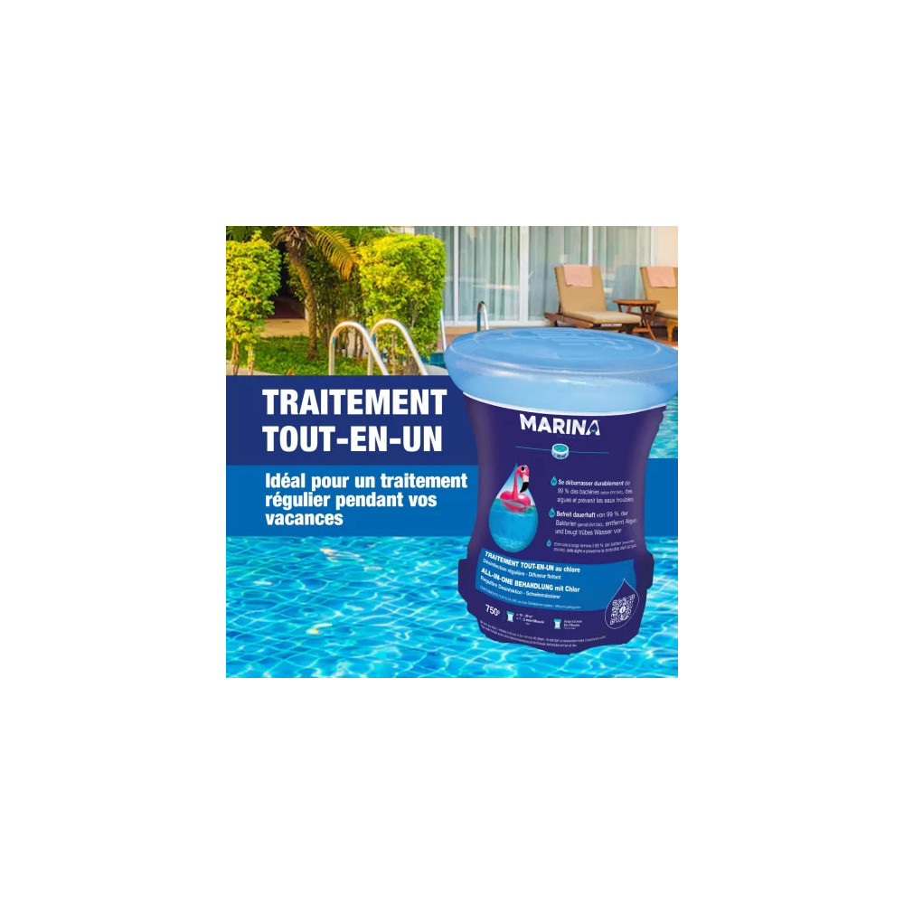 Sa formulation multifonction au chlore assure simultanément la destruction des bactéries, virus et champignons, tout en intégrant une action anti-algues et clarifiante pour maintenir une eau limpide et transparente. En un seul produit de 750g, il cumule les fonctions habituellement assurées par plusieurs traitements, simplifiant considérablement l'entretien régulier du bassin.