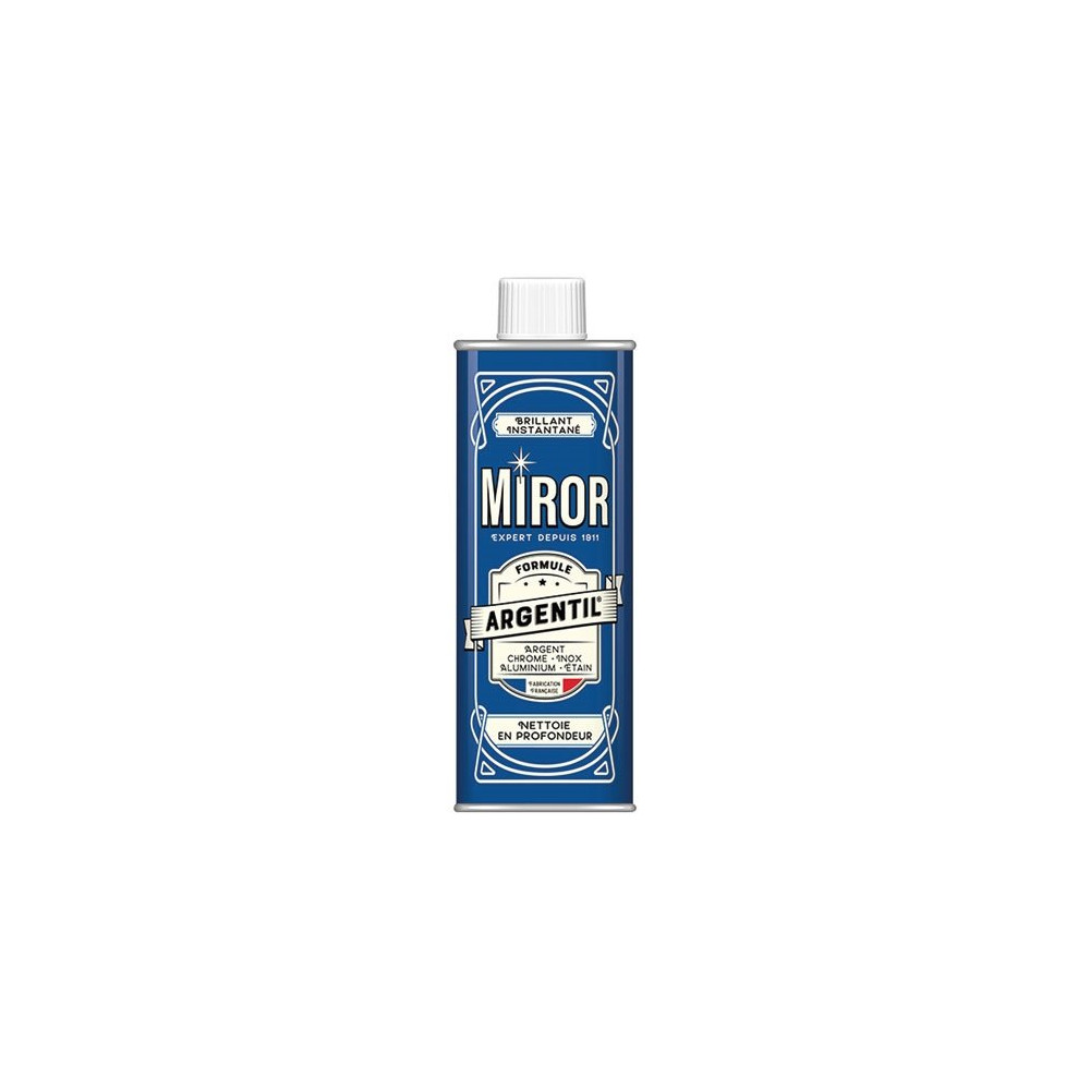 Miror Formule Argentil en flacon de 250 ml est le nettoyant de référence pour redonner tout leur éclat aux métaux précieux et aux surfaces métalliques du quotidien. Fabriqué en France, ce produit à la formule longue durée nettoie en profondeur sans effort, pour des surfaces impeccables qui brillent durablement.