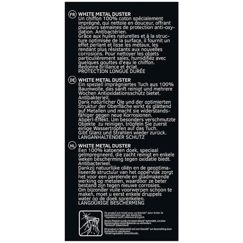 Fabriqué en 100% coton, ce chiffon est imprégné d'un mélange d'huiles naturelles et d'argile minérale aux propriétés antibactériennes. Ces actifs lissent la surface traitée, estompent les micro-rayures et déposent un film protecteur qui favorise l'égouttage de l'eau, limitant ainsi les traces et l'oxydation.
