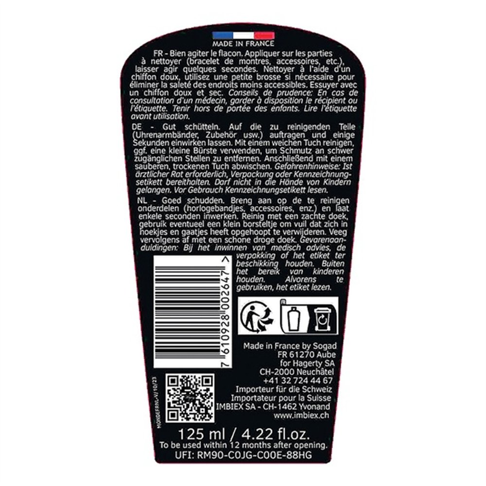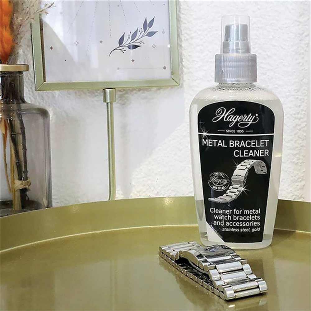 Avec le temps, les bracelets de montre, bijoux et accessoires en métal perdent leur éclat d'origine sous l'effet de la transpiration, des résidus cosmétiques et des saletés accumulées. Le nettoyant HAGERTY spécial bracelets acier, inox et or en format 125 ml redonne en quelques instants leur brillance initiale à ces pièces précieuses ou de mode.