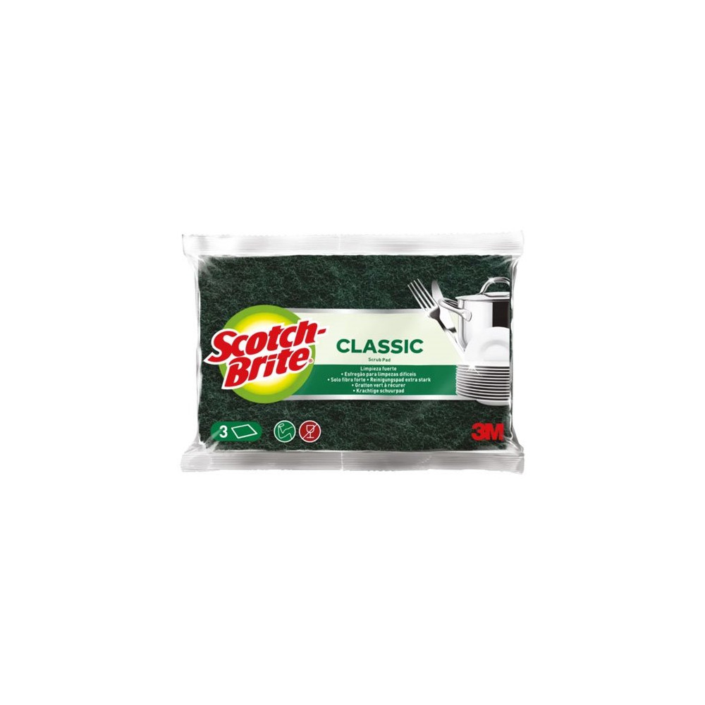 Attention : le tampon vert Scotch-Brite est conçu pour les surfaces résistantes (inox, fonte, céramique non revêtue, plaques de cuisson). Il n'est pas recommandé sur les revêtements antiadhésifs délicats, qui nécessitent une éponge plus douce pour ne pas être rayés.