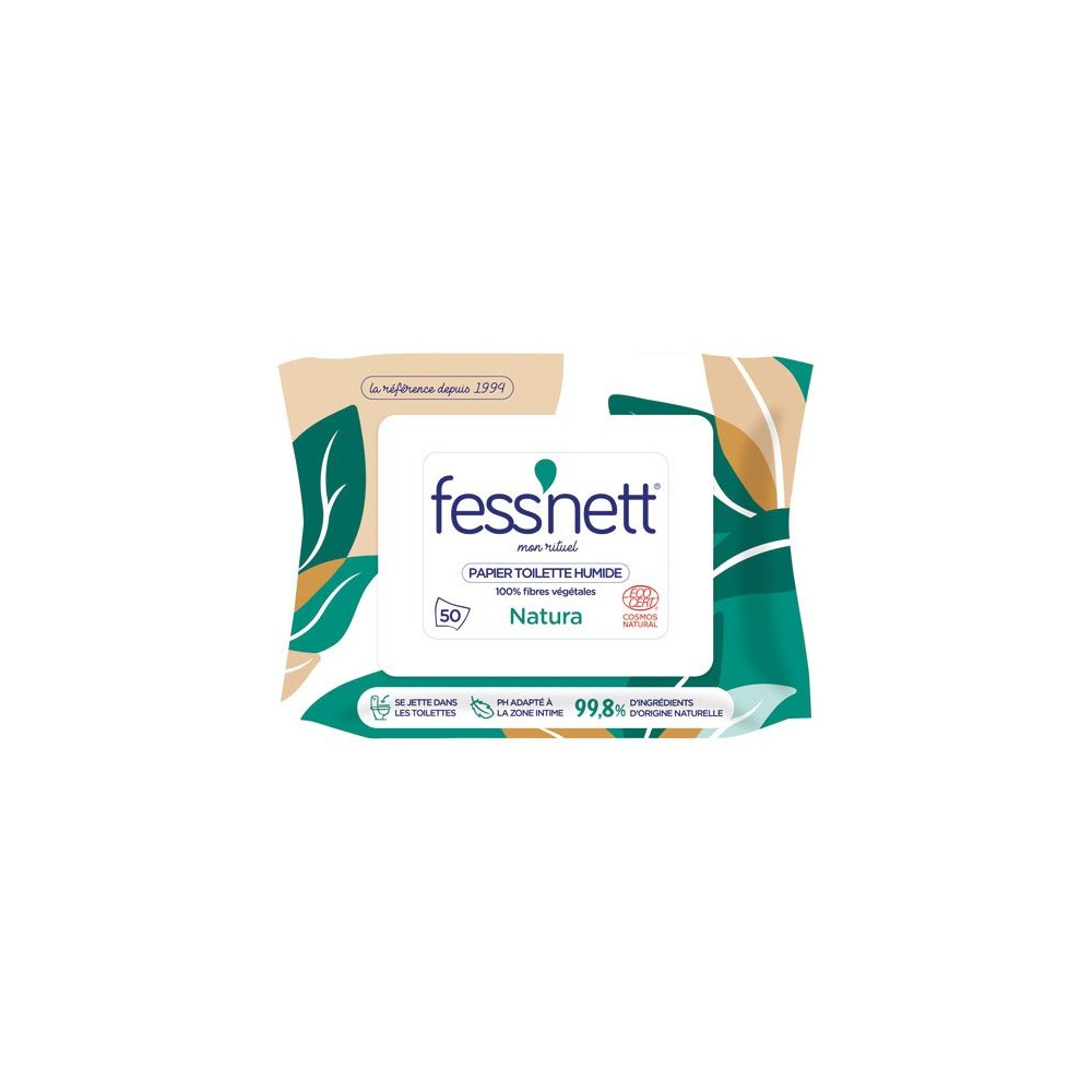 Le papier toilette humide Natura 100% fibres végétales en lot de 50 lingettes de la marque Fess'nett nettoie en douceur tout en procurant une hygiène parfaite. Il s'utilise en complément du papier toilette sec. Format Pocket pour les voyages. Marque pionnière du marché. Texture hypoallergénique ultra moelleuse pour un confort absolu. Formule sans paraben, sans phénoxyéthanol et sans parfum, testée dermatologiquement. Tissu biodégradable : se jette dans les toilettes (3 lingettes max par chasse g