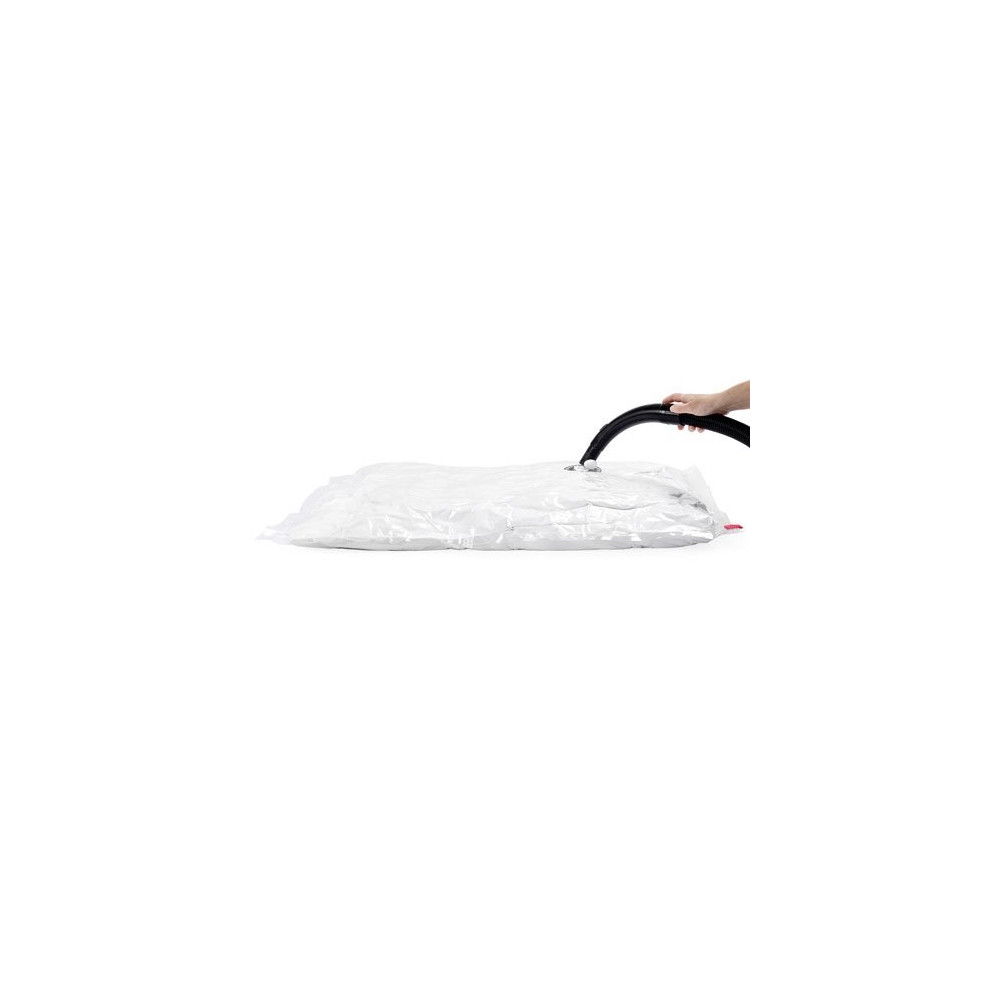 Pour une utilisation optimale, insérez votre literie propre et sèche dans le sac, fermez soigneusement la glissière, puis branchez l'embout de votre aspirateur sur la valve du sac L pour extraire l'air en quelques secondes. Stockez ensuite sous le lit, dans une valise ou sur une étagère haute — un gain de place immédiat et appréciable.