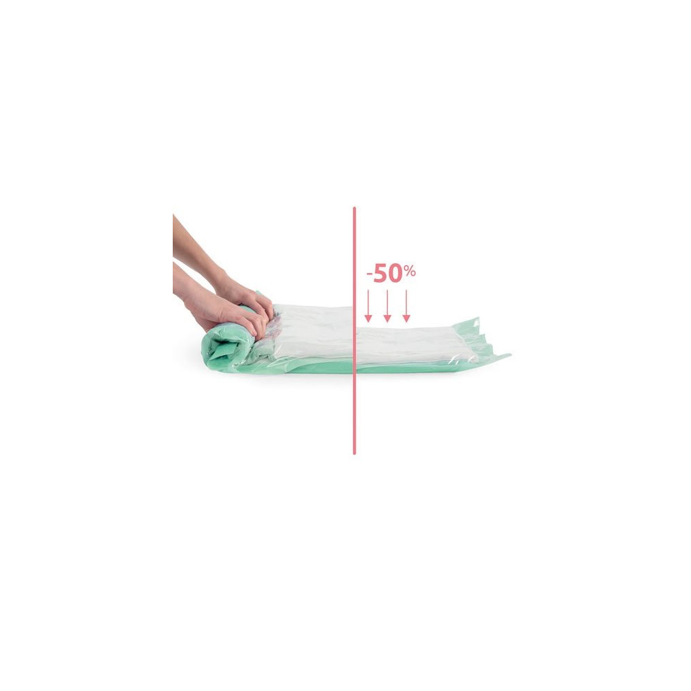 Le système roll up (roulage progressif) est particulièrement pratique : inutile d'avoir un aspirateur à portée de main — il suffit de rouler le sac depuis le bas vers le haut pour expulser l'air et réduire le volume. Ce lot de 2 est économique et vous permet de traiter plusieurs articles en même temps, qu'il s'agisse de blousons, de pulls ou de vêtements de sport volumineux.