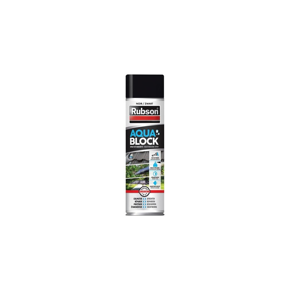 Le revêtement d'étanchéité RUBSON Aquablock Spray en noir, format 300 ml, est une solution prête à l'emploi ultra-rapide pour colmater efficacement fuites, fissures et microfissures sur une grande variété de supports. Sa formule à base de caoutchouc et de résines de synthèse forme un film souple, imperméable et adhérent qui se comporte comme un vrai joint étanche, capable d'absorber les mouvements et les vibrations sans se décoller.