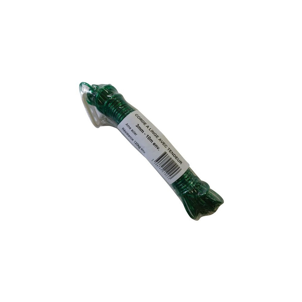 La corde à linge 3mm âme acier avec tendeur coloris vert de chez Corderie Tournonaise est utilisée dans le jardin. Résistance rupture en kgf = 100. La longueur mesure environ 10 m. Emballée sous format carotte. Une corde à linge avec tendeur est une corde utilisée pour étendre le linge à sécher, équipée d’un système de tension (le tendeur) qui permet de la maintenir bien tendue, même lorsqu’elle est chargée de vêtements mouillés.