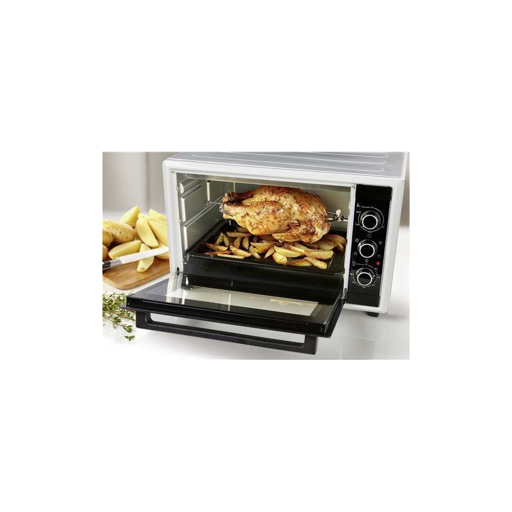 Mini four multifonctions avec programmation mécanique - FC4200MW - Four compact à grande capacité (42 L) pour cuire vos plats familiaux - 5 modes de cuisson, dont chaleur tournante, pour cuisiner toutes vos envies ! Cuisinez vos volailles grâce au tournebroche - Choisissez le mode adapté à votre préparation. Utilisez le gril pour gratiner, la chaleur tournante pour une cuisson homogène ou le tournebroche pour cuisiner vos volailles - 3 gradins - Une simplicité de nettoyage grâce à la cavité anti