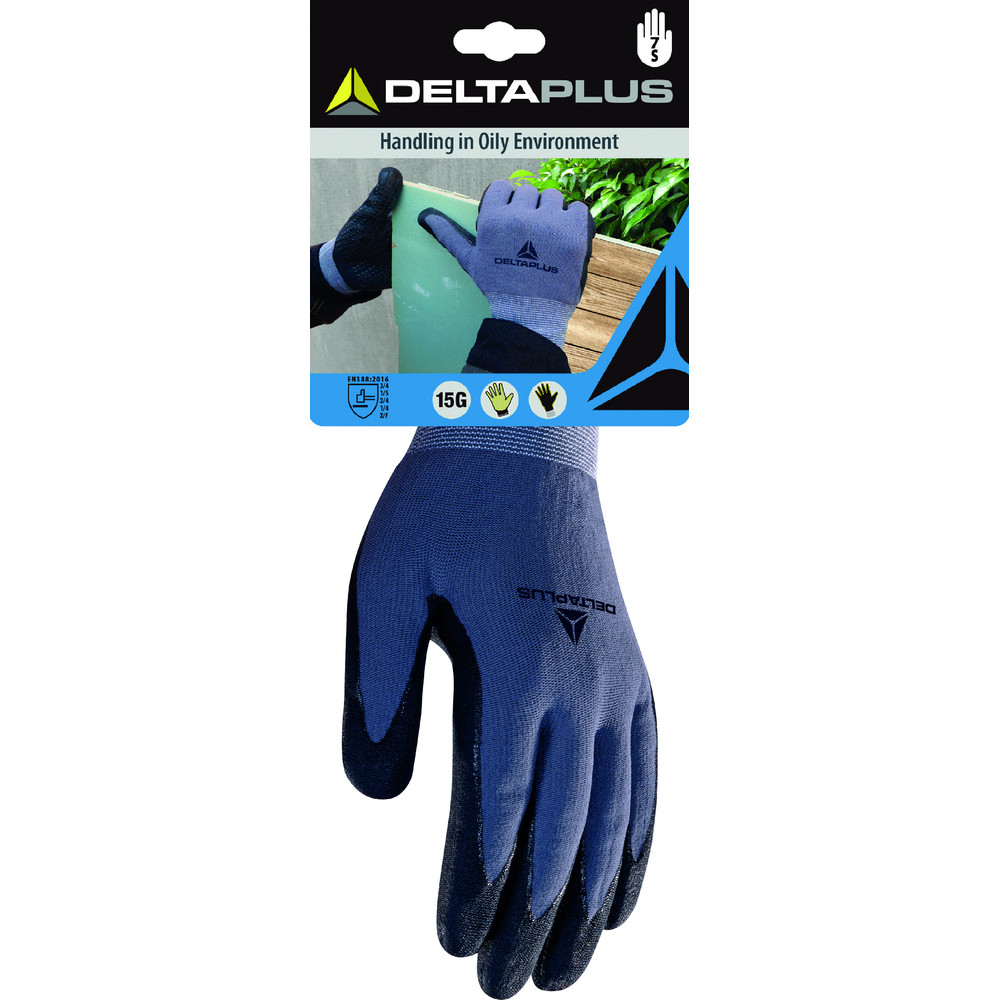 Leur support en polyamide/Spandex à jauge 15 — la plus fine de la gamme — garantit un tricot ultra-léger qui épouse parfaitement la main. L'enduction nitrile/polyuréthane sur la paume et le bout des doigts assure une résistance aux huiles et aux graisses, renforcée par des picots nitrile sur la paume qui démultiplient l'adhérence sur toutes les surfaces, même humides ou glissantes.